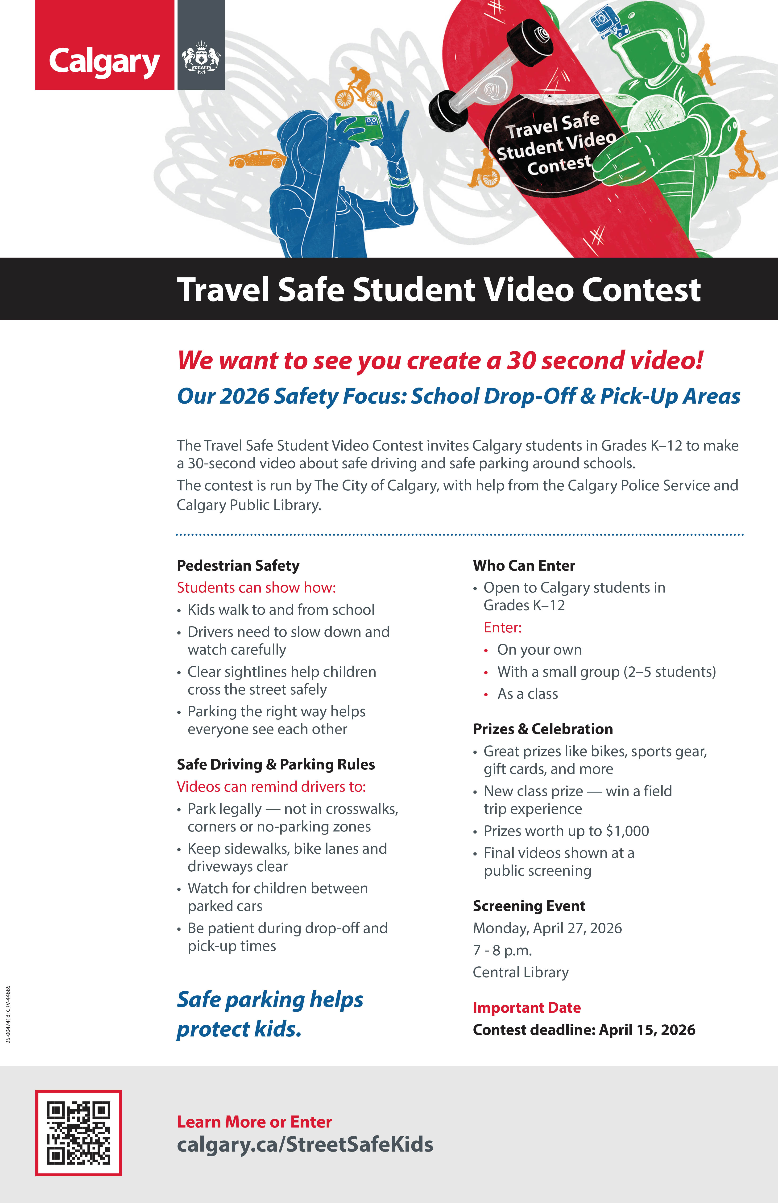 By bringing safe parking into the pedestrian safety conversation, the Travel Safe Student Video Contest is helping young Calgarians tell a bigger story—one where safer streets are built through everyday choices, shared responsibility and care for one another.